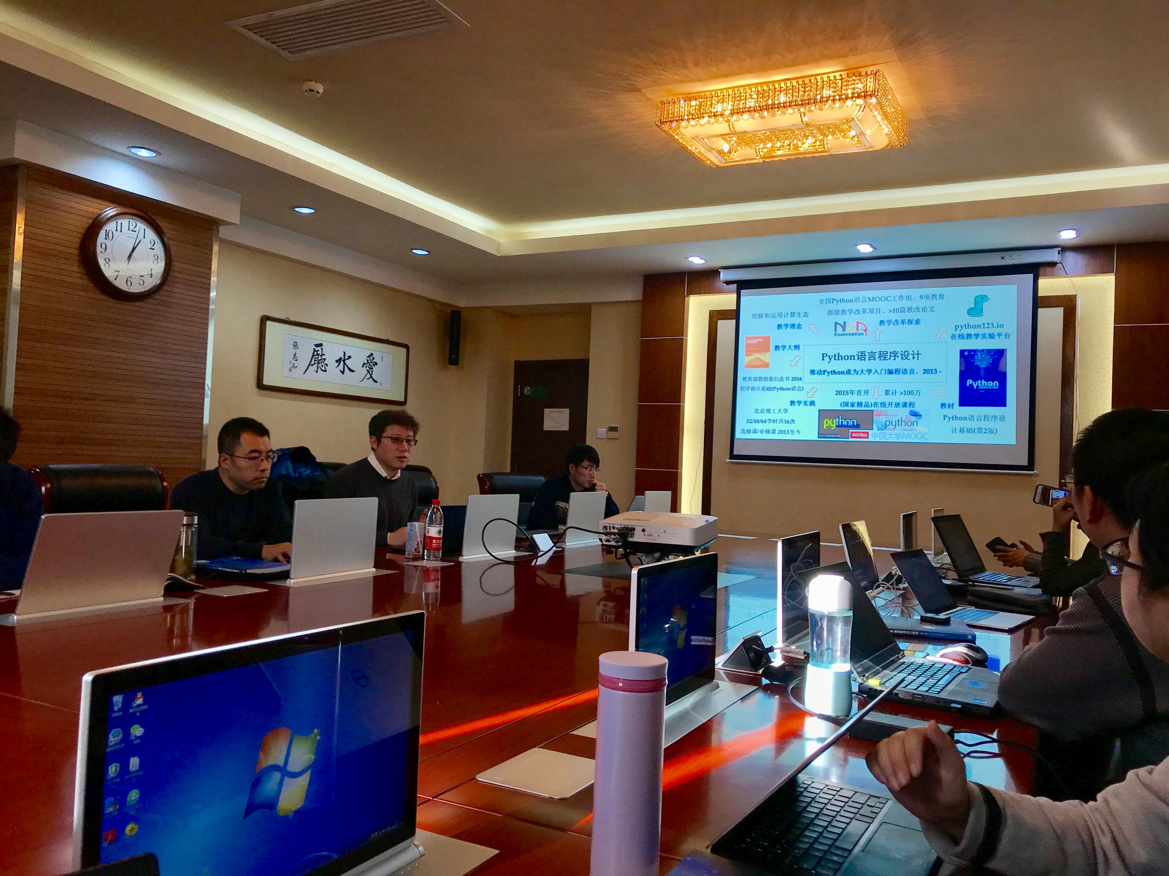 12月28日,为了更好地开展校际合作,推动计算机必修课的教学改革,禁闻网 邀请国内知名Python教学专家北京理工大学嵩天副教授对课程安排、知识点整理、考试考核方式等进行了共同研讨。