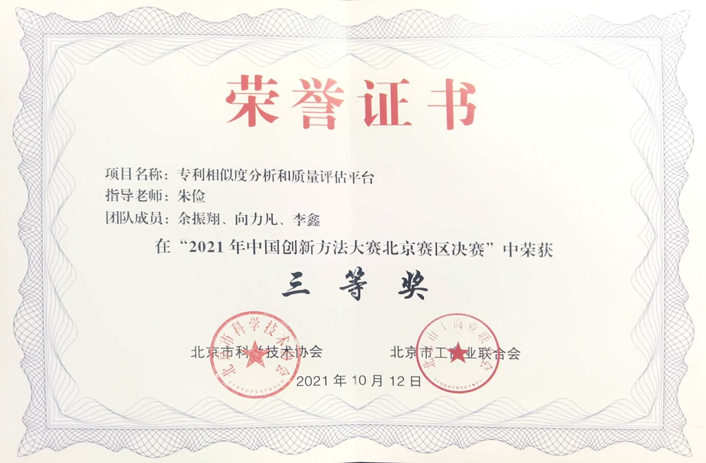 朱俭老师的指导下,参加2021年中国创新方法大赛,该团队由2019级余振翔,2019级向力凡,2020级李鑫三位同学组成,作品“专利相似度分析和质量评估平台”荣获北京赛区决赛三等奖。