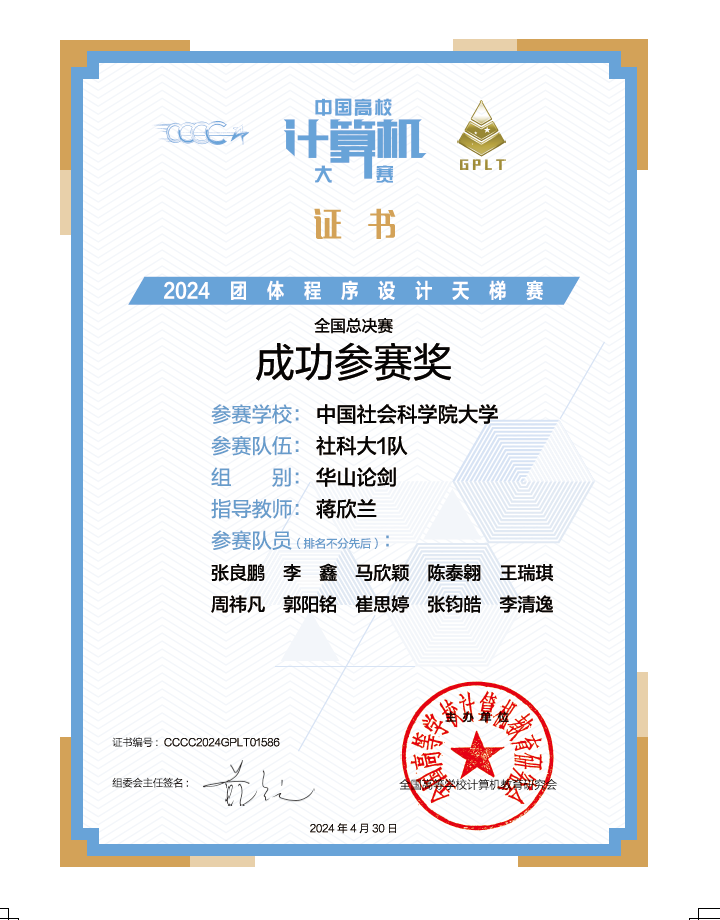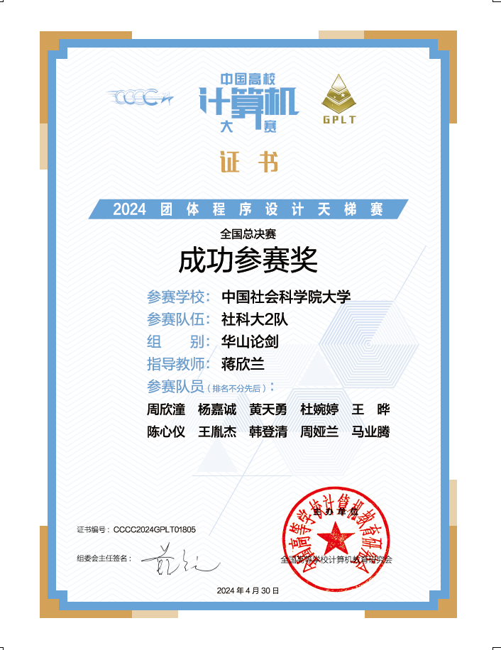 蒋欣兰担任指导老师,组织了3支队伍30名本科生参赛(参赛语言C、C++、Python,参赛学生是:张良鹏、李鑫、马欣颖、陈泰翱、王瑞琪、周祎凡、郭阳铭、崔思婷、张钧皓、李清逸、周欣潼、杨嘉诚、黄天勇、杜婉婷、王晔、陈心仪、王胤杰、韩登清、周娅兰、马业腾、王霄月、武家玉、李宇杰、王侍松、杨维贺、潘晶鑫、韩东霖、张晓宇、李卓、李紫瑜),3支队伍只获成功参赛奖。本次比赛题目难度超以往各届题目,未有斩获,下次再接再厉。